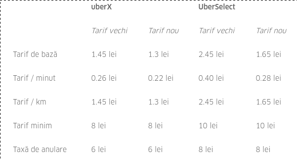 "Vrem ca Uber sa fie cea mai ieftina modalitate de a te deplasa prin oras, indiferent de ora, in fiecare zi. Ca urmare, incepand de astazi, 30 august, ora 10:00 reducem tarifele uberX si UberSelect cu 10, respectiv 30%.", se arata in comunicatul celor de la Uber.