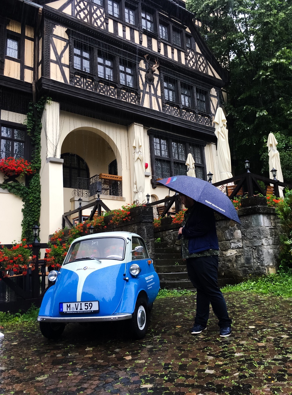 Totodata, imi vine in minte (si zambesc) acum un alt automobil: BMW Isetta. O micro-masina construita dupa un model italian de catre BMW, insa bavarazii au schimbat-o atat de mult incat nimic nu semana cu masina originar italiana. Masina avea un motor de un cilindru de 247 cm3 care era, de fapt, motorul unei motociclete. I se spunea „locul de giugiuleala”, intrucat spatiul era foarte mic pe bancheta masinii. Primul model lansat de BMW a fost prezentat lumii in aprilie 1955. Productia a durat 7 ani, timp in care au fost construite 161,728 de unitati. Modelul prezent la Sinaia poate fi vazut la showroom-ul XCars din Targu-Mures.