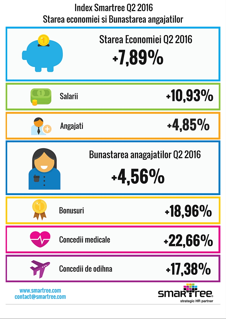 Potrivit Smartree Workforce Index, primul semestru din 2016 a adus si o crestere de cca. 19% a numarului de zile de concediu de odihna luate de catre angajati, in timp ce numarul de zile de concediu medicale au fost mai mari cu peste 17%.