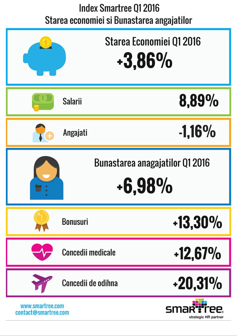 Potrivit Smartree Workforce Index, primul semestru din 2016 a adus si o crestere de cca. 19% a numarului de zile de concediu de odihna luate de catre angajati, in timp ce numarul de zile de concediu medicale au fost mai mari cu peste 17%.