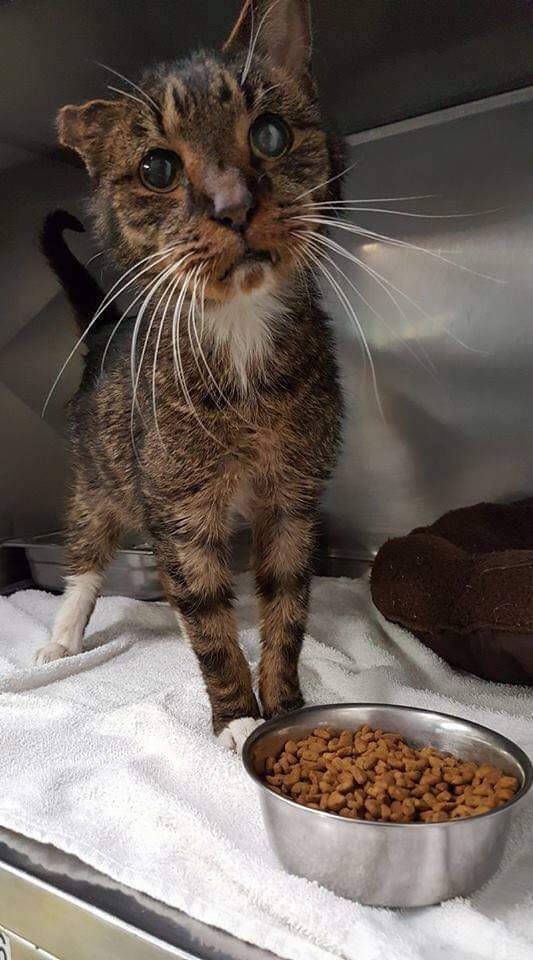 Pisica a fost salvată și trimisă la Orfelinatul pentru Animale Voorhees unde a fost îngrijită. Doctorii au înțeles imediat că va fi foarte greu să găsească pe cineva dornic să adopte o pisică bătrână și bolnavă. Așa că a fost aproape o minune când aceștia au primit un telefon de la doctorul Ed Sheehan care voia să trateze pisica la clinica lui.