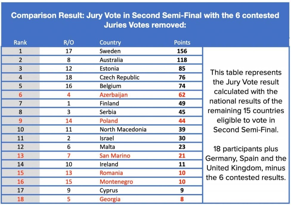 EBU invocă Regulamentul Eurovision Song Contest şi instrucţiunile oficiale de vot ale Concursului, potrivit cărora dacă voturile juriilor naţionale prezintă modele de vot neregulamentare (după cum poate fi detectat de Partenerul de vot paneuropean şi recunoscut de Monitorul Independent de Votare), supervizorul executiv al ESC are dreptul de a elimina voturile în cauză pentru alocarea clasamentelor şi de a le înlocui cu un rezultat agregat substitut calculat automat pentru a determina rezultatul final al acestor ţări în a doua semifinală.