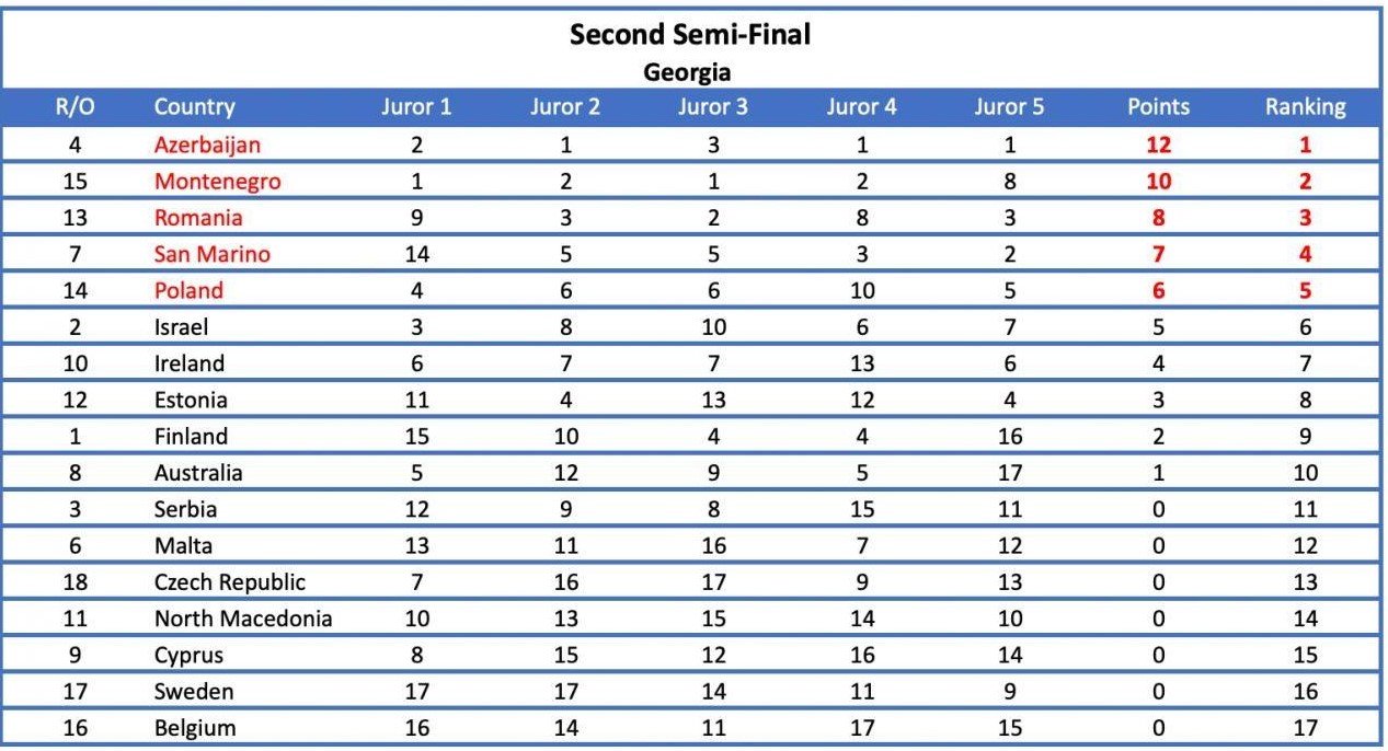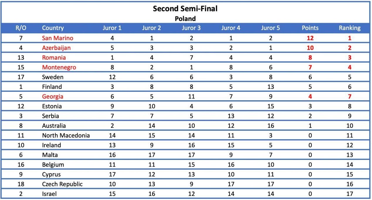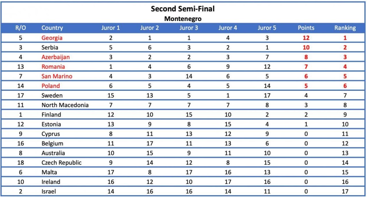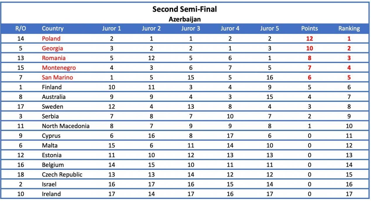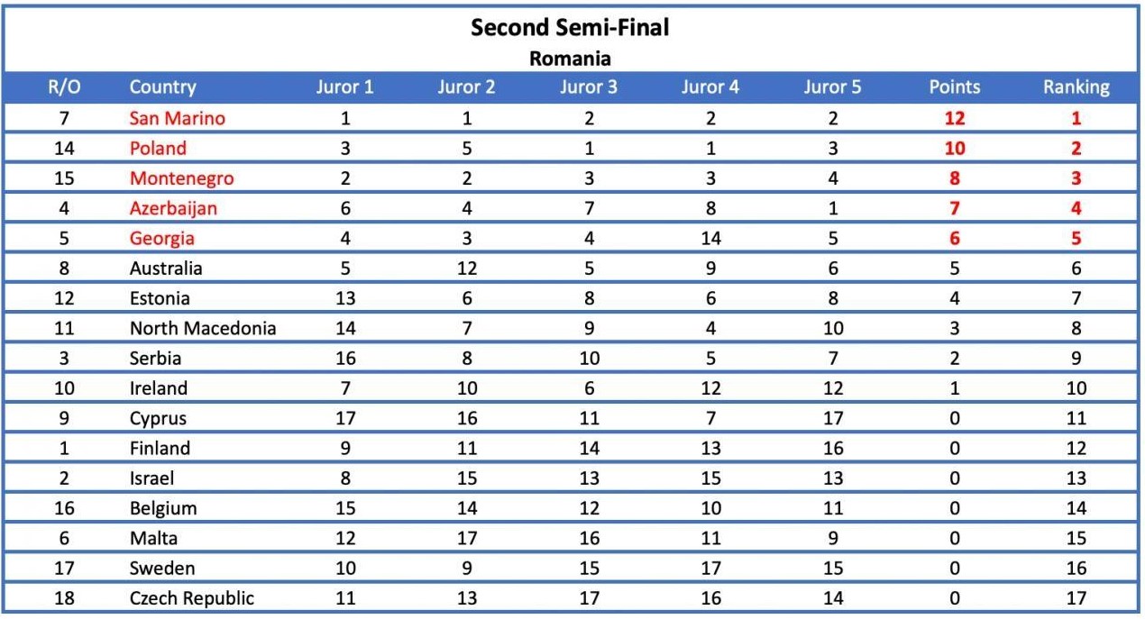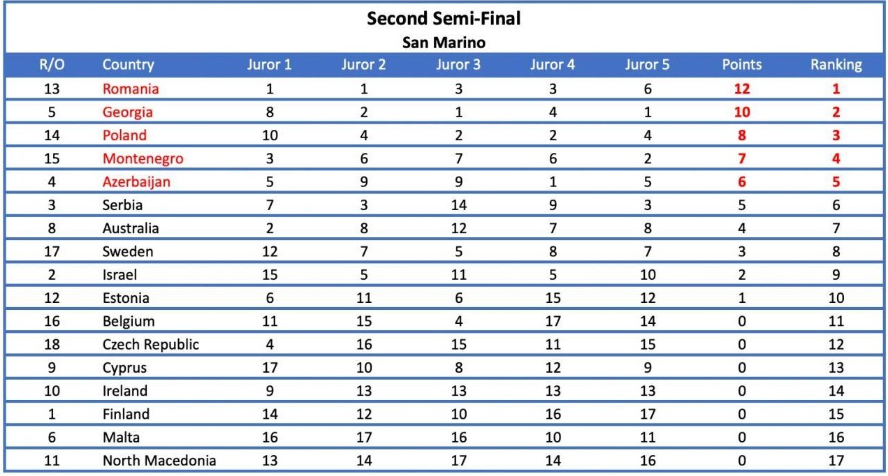 Potrivit EBU, „în cea de-a doua semifinală, s-a observat că patru dintre cele şase jurii au plasat toate cinci dintre celelalte ţări în Topul lor cinci (ţinând cont că nu au putut vota pentru ei înşişi); un juriu a votat pentru aceleaşi cinci ţări în Top 6; iar ultimul dintre cele şase jurii a plasat patru dintre celelalte ţări în Top 4 şi pe a cincea în Top 7”. Patru dintre cele şase state au primit cel puţin un set de 12 puncte, care este maximul ce poate fi acordat, precizează EBU.