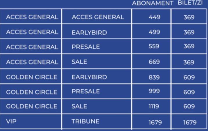 Astfel fanii pot opta pentru ziua în care concertează artistul lor preferat sau pentru un abonament de două zile, în funcție de preferințe. Prețurile pentru o singură zi pornesc de la 369 lei pentru categoria Acces General și ajung până la 1679 lei pentru categoria VIP. Biletele sunt disponibile în rețeaua iabilet.ro și pe summercity.ro