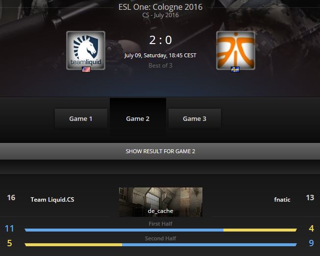 Chiar daca sectorul polonez din Lanxess Arena a fost dezamagit de faptul ca echipa lor nu a reusit sa ajunga in finala, ESL One Cologne a continuat cu o noua confruntare intre Fnatic(Suedia) si Team Liquid(SUA). Toata lumea se astepta ca Fnatic sa treaca de Team Liquid, insa suedezii au fost surprinsi de o echipa foarte bine inchegata, fiind eliminati de la major-ul din Germania cu 2-0.