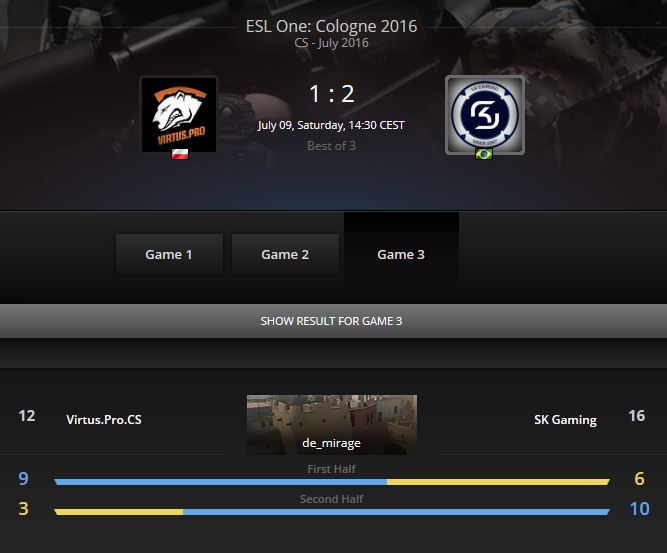 Desi Virtus Pro s-au aflat la inaltimea asteptarilor, povestea a cunoscut un cu totul alt final pe de_nuke, care a fost alegerea polonezilor. SK Gaming s-au regrupat si au gasit calea succesului. Brazilienii au reusit sa duca confruntarea pe de_mirage. Este cunoscut faptul ca ambele echipe sunt foarte, foarte bune pe aceasta harta, insa SK Gaming au reusit sa se impuna si aici cu scorul de 16-12, avansand in finala de duminica.