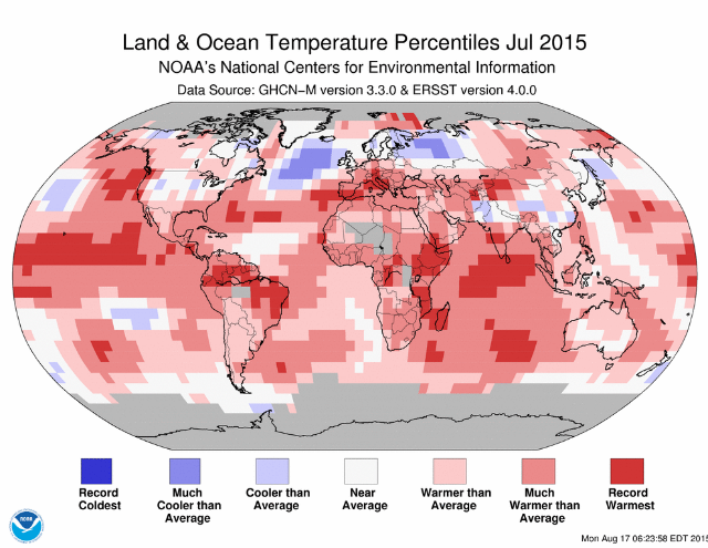 Astfel, temperatura medie combinata la suprafata uscatului si a oceanelor de pe Terra s-a situat in iulie 2015 cu 0,81°C peste media secolului al XX-lea (15,8°C) si a depasit cu 0,08 grade Celsius precedentul record de temperatura medie lunara, stabilit in iulie 1998.