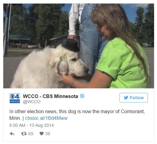 In Minnesota lucrurile au stat un pic altfel, intrucat cainele de rasa Great Pyrenees a castigat alegerile si a primit mandatul de primar pentru un an de zile. Salariul acestuia este reprezentat de mancare gratis pentru caini pe durata mandatului, donata de un magazin local pentru animale, conform HuffingtonPost.com