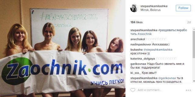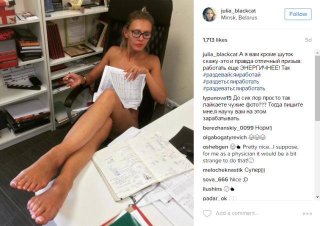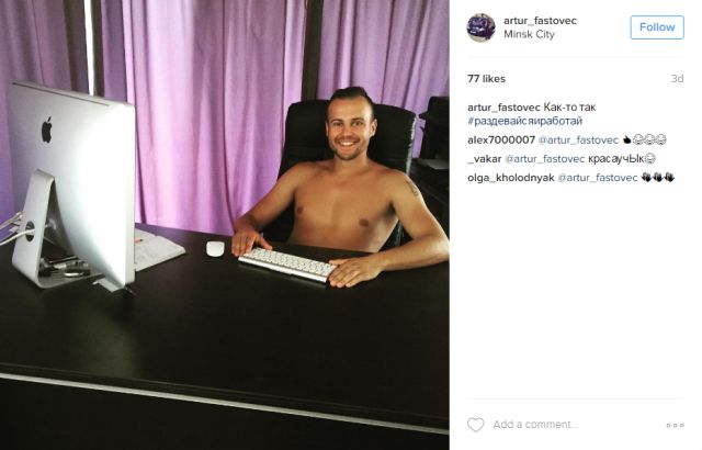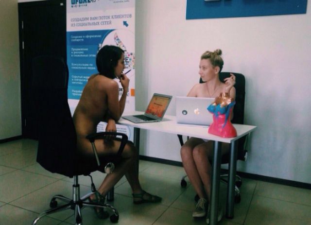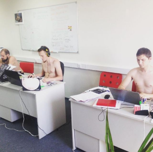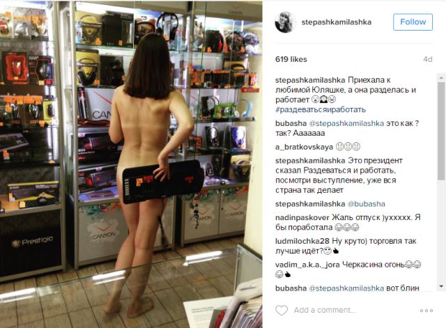 Sub #getnakedandgotowork (#раздеватьсяиработать), oamenii au inceput sa posteze poze cu ei dezbracati la locul de munca, cele mai multe insotite de comentariul: "Daca liderul nostru spune ca trebuie..."