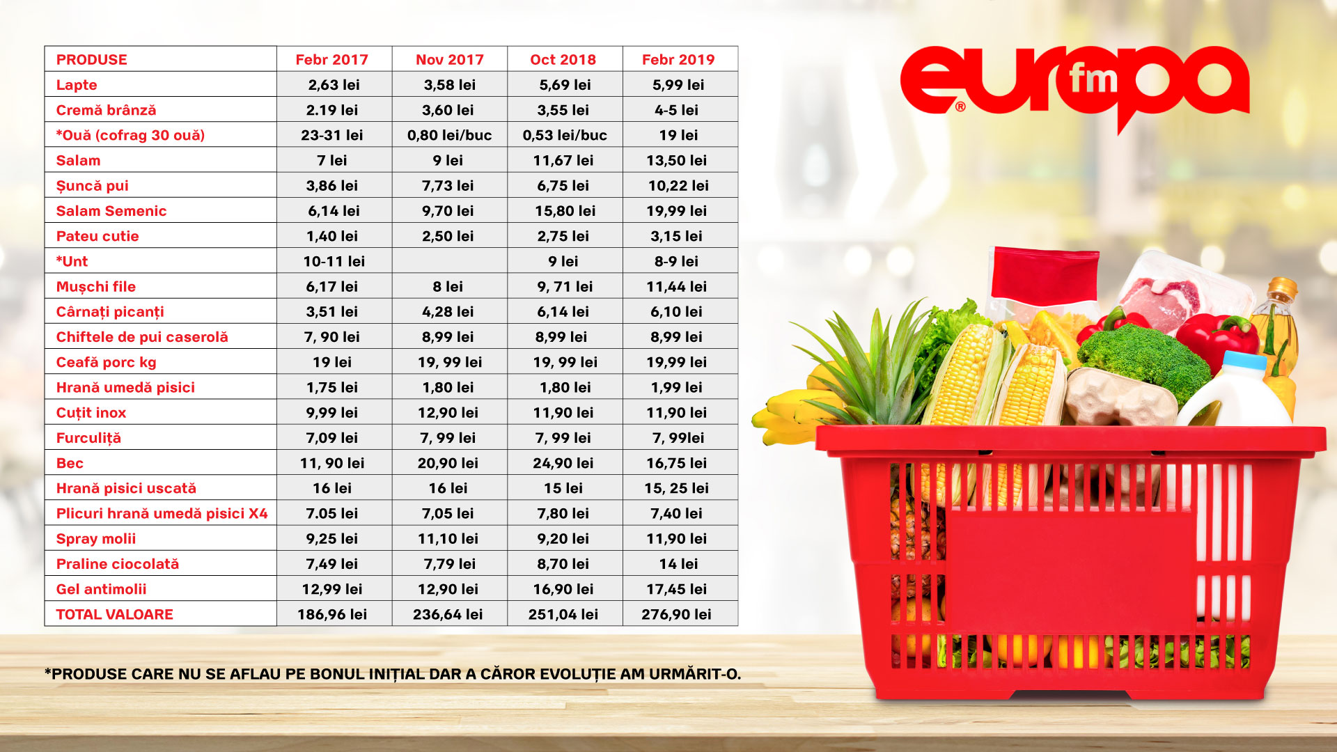In noiembrie 2017, ne-am propus sa mergem la cumparaturi in acelasi hypermarket si sa luam exact aceleasi produse de pe un bon din februarie acelasi an, ce valorase 186,96 de lei. La 9 luni diferenta, constatam o scumpire cu peste un sfert pentru aceleasi cumparaturi.