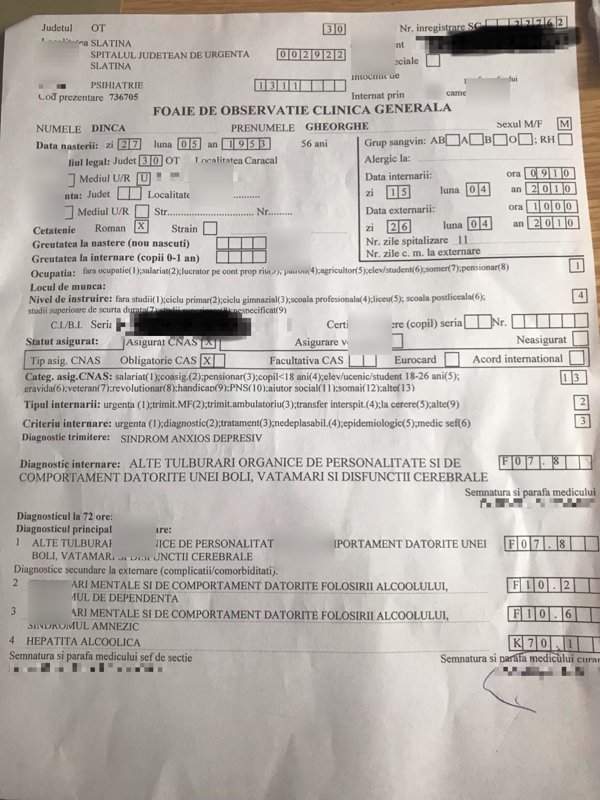 Potrivit surselor mentionat anterior, ultima internare a barbatului a avut loc in aprilie 2010. Atunci, a fost internat pentru sindrom anxios depresiv, dar in spital medicii i-au pus ca diagnostic secundar "Tulburari mentale si de comportament datorate folosirii alcoolului", sindrom de dependenta, sindrom amnezic si hepatita alcoolica.