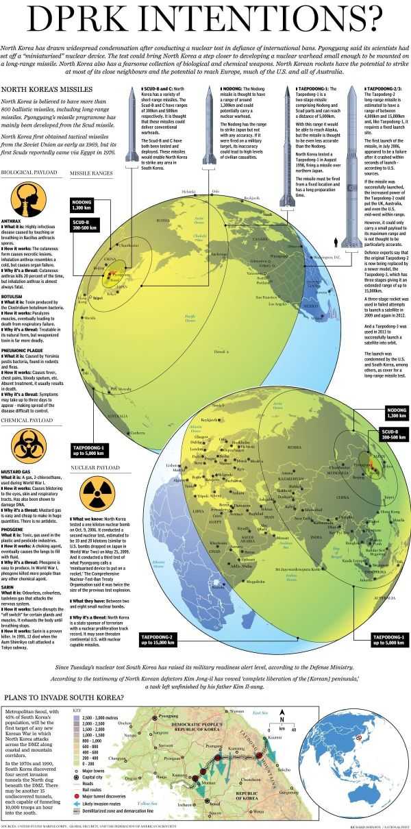 Rachetele de raza lunga Taepodong-2 au o raza de actiune intre 4.000 si 15.000 de kilometri, insa au o capacitate de incarcare destul de mica si nu sunt foarte "precise", avand nevoie de o baza de lansare fixa, dupa cum indica infograficul de mai jos. Datorita razei de actiune mari, foarte putine locuri de pe planeta se afla la distanta sigura de un astfel de atac cu rachete.