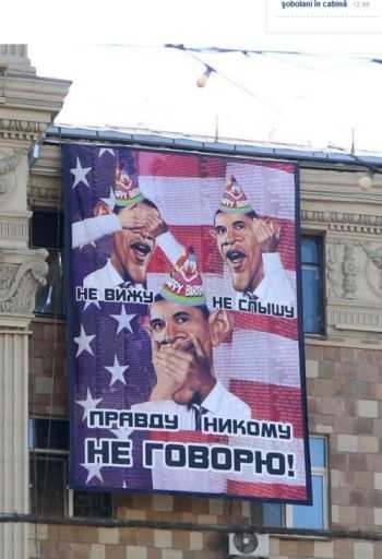 "Nu vad ... Nu aud ... Nu spun adevarul nimanui", se poate citi pe bannerul care il infatiseaza pe liderul american in ipostaze exagerate, inclusiv cu urechi supradimensionate si barbia ascutita. El apare acoperindu-si ochii, urechile si gura, relateaza Moscow Times, in editia electronica. In cele trei imagini, Obama este comparat cu cele "Trei maimute intelepte": Mizaru, care isi acopera ochii, Kikazaru, care isi acopera urechile si Iwazaru, care isi acopera gura.