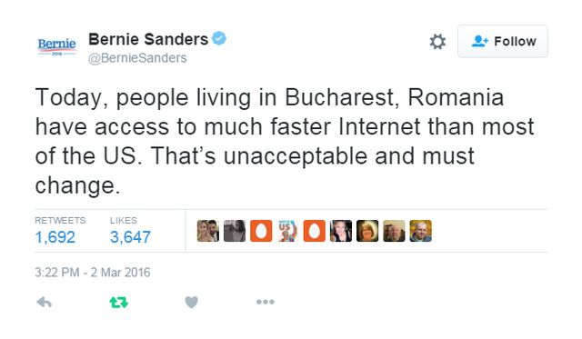 "Azi, oamenii ce locuiesc în Bucureşti, România, au acces la un internet cu o viteză mult mai mare decât majoritatea zonelor din Statele Unite. Acest lucru este inacceptabil şi trebuie schimbat", a scris Bernie pe Twitter.