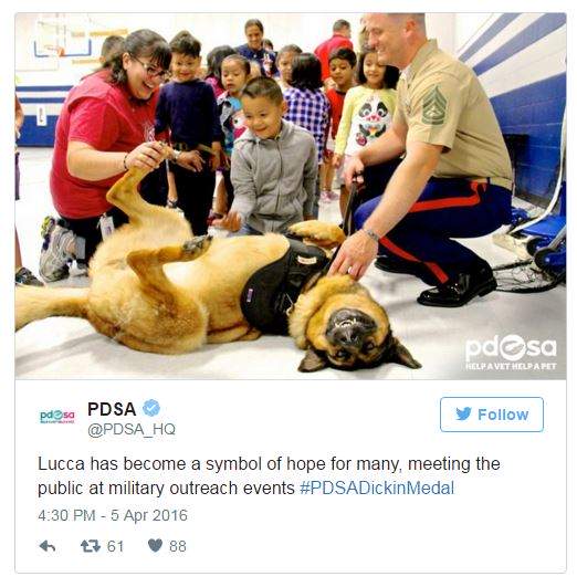 Fiind la datorie in 2012, cainele Lucca si-a pierdut piciorul stang din fata din cauza unei bombe care a explodat. Acesta a supravietuit si a salvat in acel moment 6 soldati britanici. In toti cei 6 ani a efectuat peste 400 de misiuni si a ajutat la detectarea a peste 700 de bombe. Niciun soldat si niciun civil nu au murit in toate misiunile sale.
