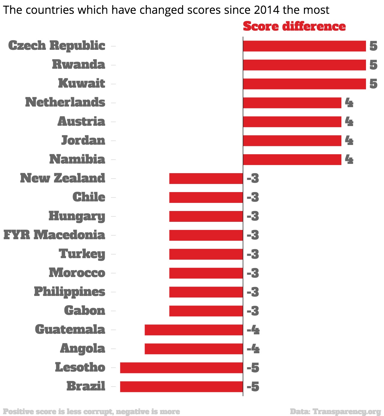 Brazilia si Lestho au scazut cel mai mult fata de 2014, in timp ce Cehia, Kuweit, Olanda si Austria au crescut.
