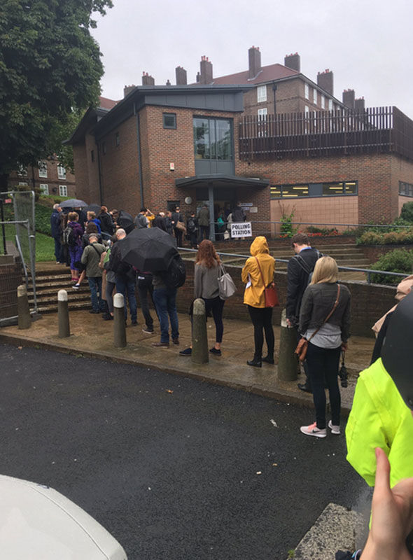 Cozile continua si in a doua parte a zilei. O sectie de votare a fost inchisa si inlocuita cu una mobila, intrucat inundatiile au patruns in incinta. Cozi la mai multe sectii de votare din Regatul Unit. Participantii de la Festivalul din Glastonbury indreptandu-se catre sectia de votare.
