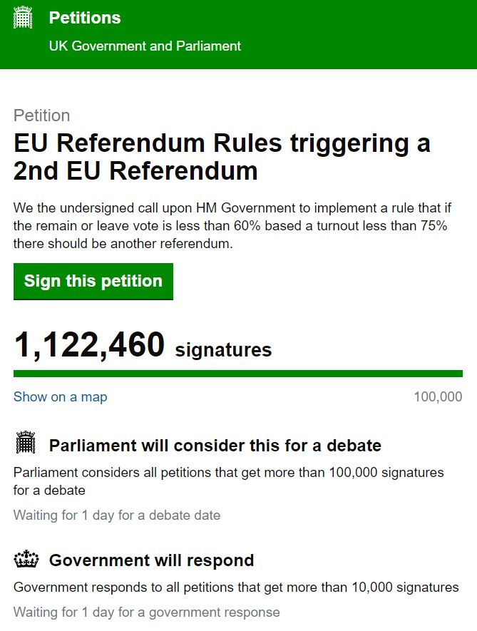 La ora scrierii acestui articol erau deja 1.122.460 de semnaturi inregistrate pe site-ul oficial al Guvernului Regatului Unit.