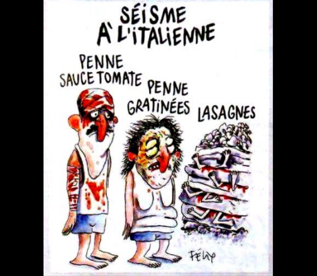 Cu doua saptamani in urma, Charlie Hebdo a publicat o caricatura intitulata ”Earthquake, Italian Style” (Cutremur, in stil italian), care prezinta un barbat acoperit de sange, cu mesajul ”Penne, in sos tomat”, o femeie carbonizata, alaturi de comentariul ”penne acoperite de crusta”, precum si trupuri aflate sub daramaturi, alaturi de comentariul ”Lasagna”, a anuntat, luni, site-ul news.com.au, care citeaza DPA.