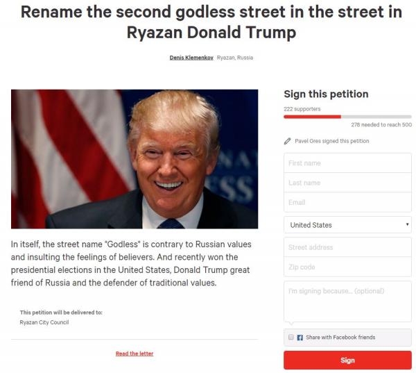 "Unii au considerat-o o gluma si au semnat ca era distractiv, altii au facut-o pentru normalizarea relatiiolor SUA-Rusia, iar altii au semnat pentru ca nu le place numele de Godless", a spus Sergey Bizyukin, un tanar de 34 de ani care a insotit echipa CNN la o plimbare pe strada respectiva.