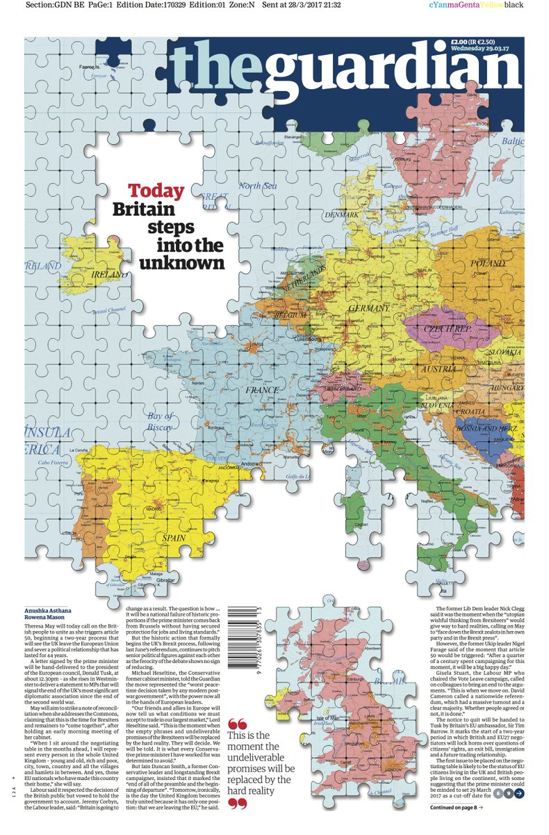 Cele doua subiecte au fost ilustrate de The Guardian cu imaginea prim-ministrului semnand scrisoarea si cu o fotografie a sotiei fostului soldat, insotite de subtitlurile: ”Intr-o zi istorica pentru Marea Britanie, Theresa May semneaza scrisoarea care ii spune UE: Am iesit...”, respectiv ”... Si intr-o zi istorica pentru justitie, sotia lui Marine A sarbatoreste vestea ca va fi acasa de Pasti”.