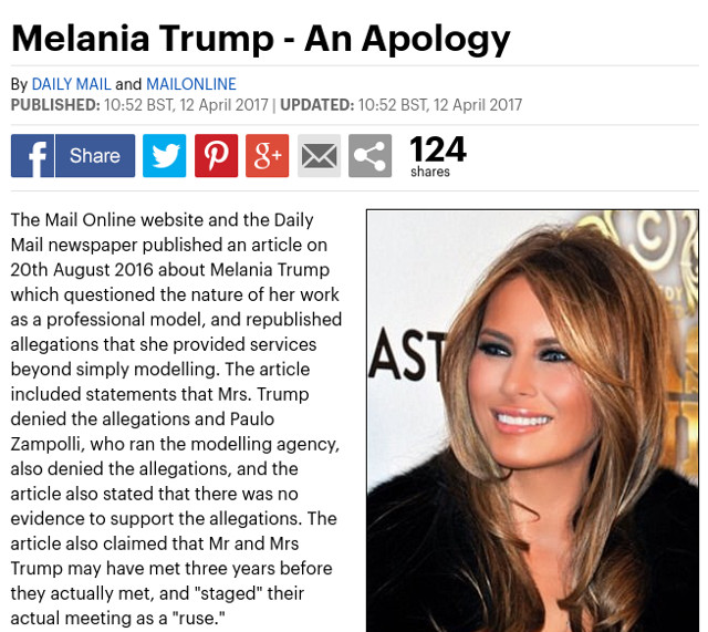 In textul prin care ii cere scuze Melaniei Trump, Daily Mail a recunoscut ca a publicat ”acuzatii potrivit carora ea a prestat servicii dincolo de cele de modelling”.