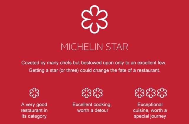 Ghidul Michelin are un sistem de notare foarte clar: o stea pentru ”foarte bun”, doua stele pentru ”merita sa faci un ocol” si trei stele pentru ”bucatarie exceptionala, merita o calatorie speciala”.