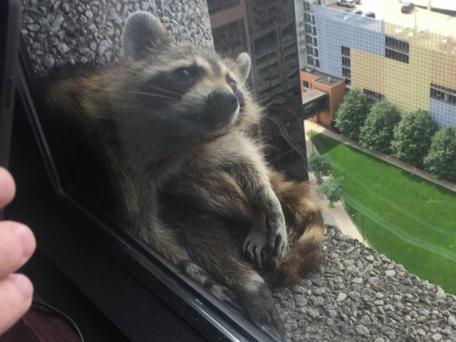 Initial vazut pe acoperisul unei cladiri de birouri din vecinatate, ratonul a decis sa sara spre cladirea cea mai apropiata, de altfel una dintre cele mai inalte din oras.
