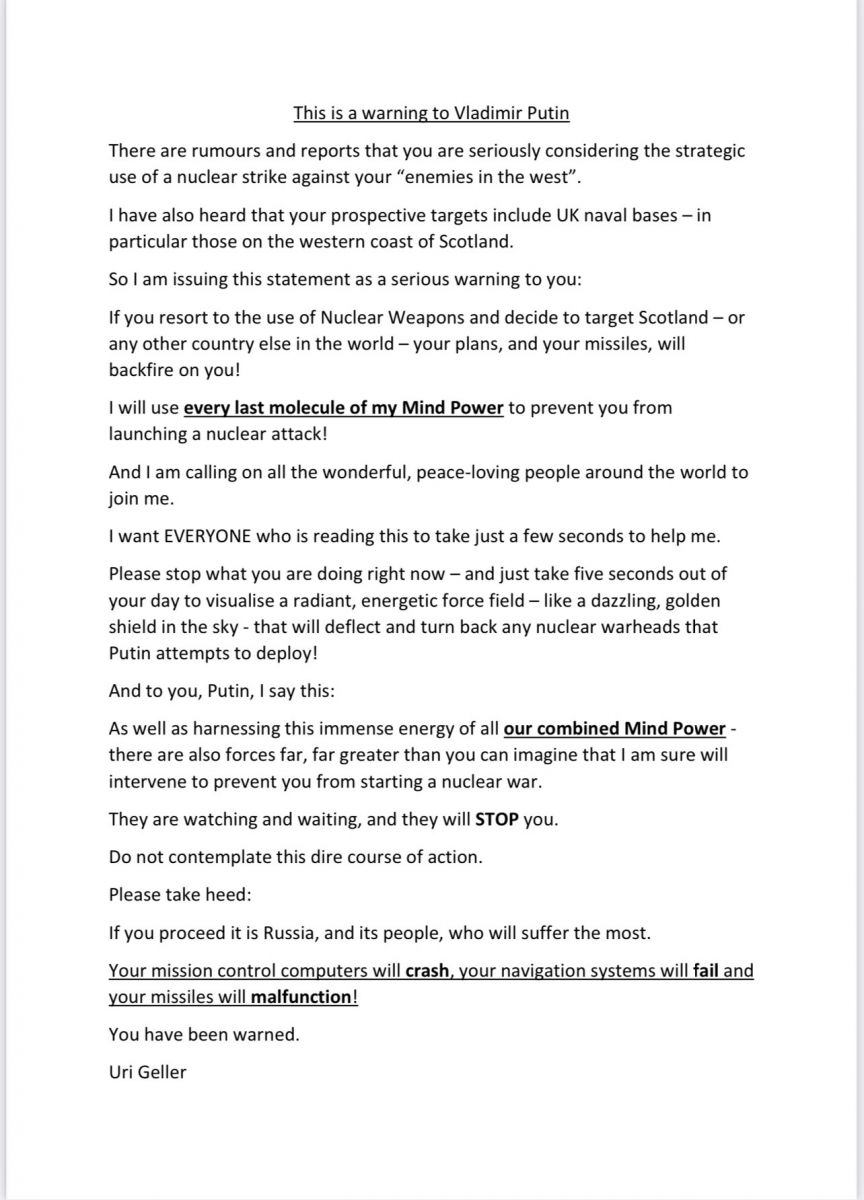 Read my warning which I sent to the Kremlin #Putin #Kremlin #Scotland pic.twitter.com/bT3vDEGb9p— Uri Geller (@theurigeller) August 2, 2022