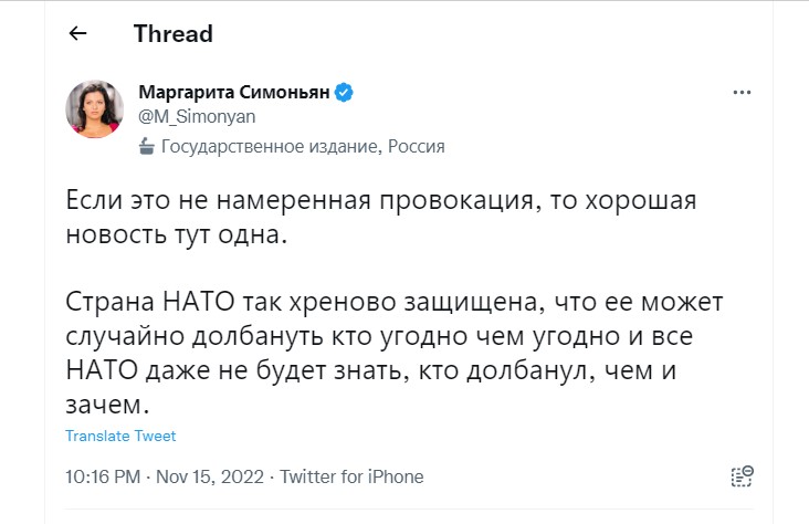 „Cu excepția cazului în care aceasta este o provocare deliberată, există o singură veste bună. O țară NATO este atât de prost protejată, încât ar putea fi lovită accidental de oricine și nici măcar nu va ști cine a lovit-o, cu ce, sau de ce”, a scris Margarita Simonian pe contul său de Twitter.