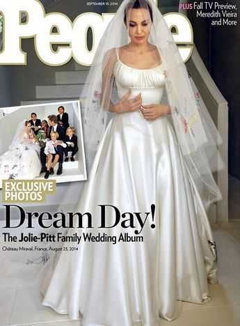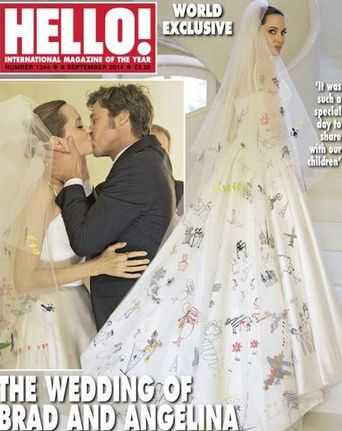 Actrita americana o rochie de mireasa din satin de culoarea fildesului, decorata pe spate cu desenele realizate de cei sase copii ai cuplului. Voalul purtat de Angelina Jolie a fost si el decorat cu desene realizate de copii, tinuta fiind o creatie marca Atelier Versace.