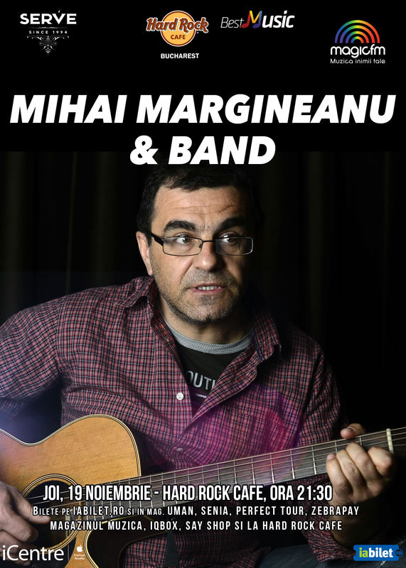 Biletele pentru showul Mihai Margineanu se gasesc in format electronic pe www.iabilet.ro, in reteaua fizica iabilet.ro (www.iabilet.ro/retea - Magazinul Muzica, Agentiile Perfect Tour, Magazinele Uman si VGeneration, IQ BOX, reteaua de magazine Say – partener Orange, pe terminalele self-service ZebraPay din toata tara), dar si la Hard Rock Cafe.