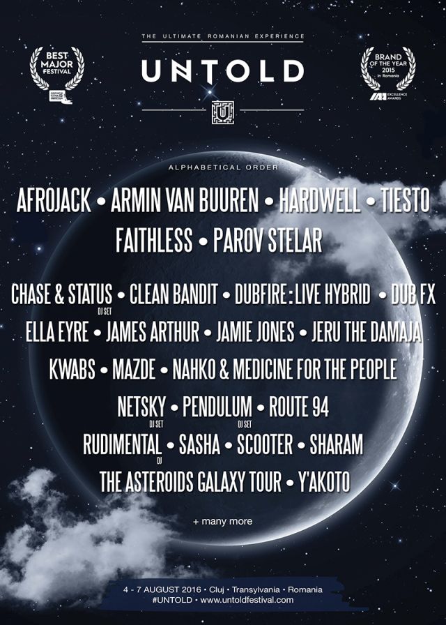 Faithless, Parov Stelar, Scooter, Chase&Status Dj, Sasha, Clean Bandit, James Arthur, RudimentalDj, Lost Frequencies, Dub Fx, Kwabs, Netsky Dj, PendulumDj, Dannic, Dubfire, Sharam, Nahko, Route 94, Jamie Jones, The Asteroids Galaxy Tour, Ella Eyre, Y akoto, Jeru The Damaja si Mazde sunt doar cativa dintre artistii care vor crea o atmosfera unica si vor face in aceasta vara fanii sa vibreze la UNTOLD FESTIVAL. Alaturi de acestia, cea mai asteptata experienta muzicala a anului din Romania are pana acum confirmati 4 regi electro-dance: Afrojack, Armin van Buuren, Hardwell si Tiesto.