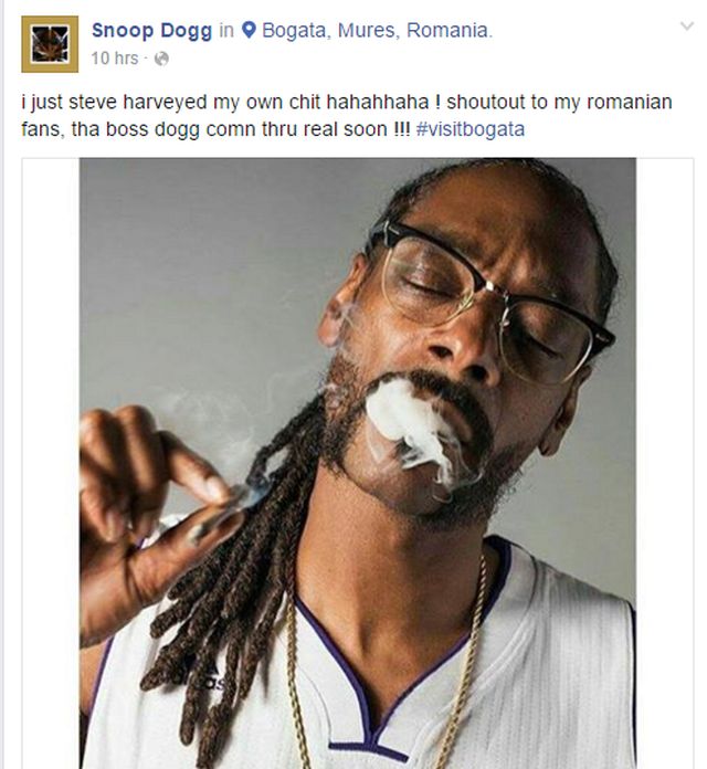 Snoop Dogg a postat o fotografie pe Instagram pe cand se afla in turneu in Columbia la Bogota si din greseala a dat check-in in Bogata, judetul Mures. Acum el a confirmat ca isi pregateste chitara pentru fanii romani si ca aceasta ''greseala'' va deveni ''curand realitate''.