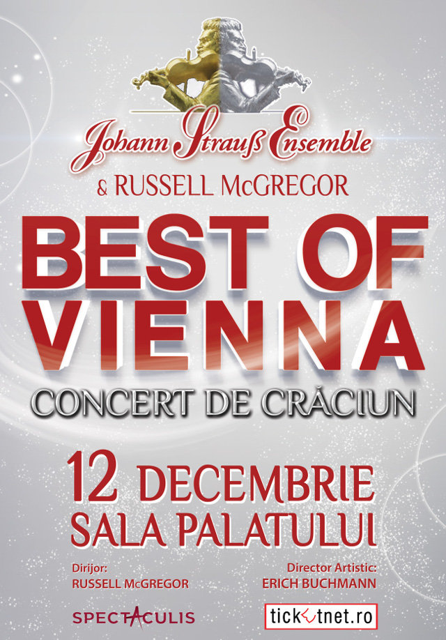 Astfel, biletele pentru concertul de Craciun, ”Best of Vienna”, ce va avea loc pe 12 decembrie, la Sala Palatului, au fost puse in vanzare la preturi cuprinse intre 59 lei si 220 lei si sunt disponibile la: Sala Palatului, magazinul Muzica, Libraria Mihai Eminescu, agentiile TUI TRAVEL CENTER si Eurolines, sau online prin www.ticketnet.ro, www.iabilet.ro, www.bilet.ro, www.bilete.ro, www.startickets.ro si www.eventim.ro.