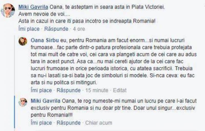 „Eu, pentru Romania, am facut enorm... si numai lucruri frumoase. Fac parte dintr-o patura profesionala care trebuia protejata tot mai mult de catre voi, cei care va plangeti acum de cei care ne-au adus tara in acest punct. Asa ca... nu mai cereti ajutor de la cei care fac lucruri frumoase in orice perioada istorica, cu atatea sacrificii. Trebuia sa nu-i lasati sa-si bata joc de simboluri si modele. Si-nca ceva: eu fac arta, si nu politica si mitinguri”, a fost replica dura data de Oana Sirbu.