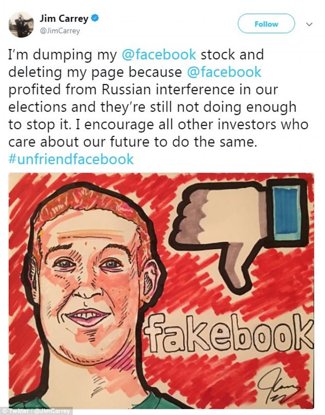 "Renunt la actiunile mele la Facebook si imi sterg pagina pentru ca Facebook a profitat de pe urma interferentelor rusesti in campania noastra electorala si inca nu fac destul pentru a le opri. Ii incurajez si pe ceilalti investitori sa faca la fel daca le pasa de viitorul nostru", a scris Jim Carrey pe Twitter.