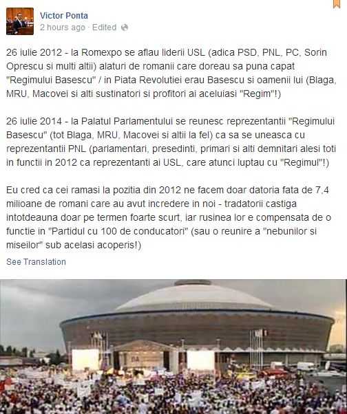 La "26 iulie 2012, la Romexpo se aflau liderii USL ( adica PSD, PNL, PC , Sorin Oprescu si multi altii ) alaturi de romanii care doreau sa puna capat «Regimului Basescu» . In Piata Revolutiei erau Basescu si oamenii lui ( Blaga, MRU, Macovei si alti sustinatori si profitori ai aceluiasi "Regim"!)", scrie Ponta pe Facebook.