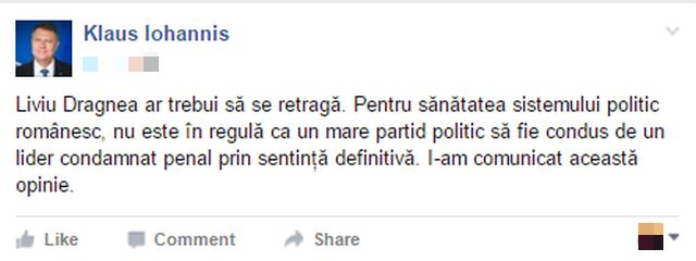 "Liviu Dragnea ar trebui sa se retraga. Pentru sanatatea sistemului politic romanesc, nu este in regula ca un mare partid politic sa fie condus de un lider condamnat penal prin sentinta definitiva. I-am comunicat aceasta opinie", a scris presedintele Klaus Iohannis pe pagina sa de Facebook.