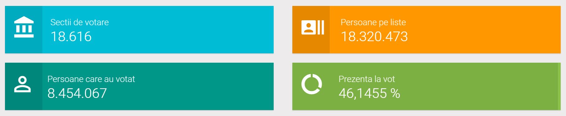 Conform ultimelor date raportate de Biroul Electoral Central si transmise de Serviciul de Telecomunicatii Special, la nivel national se inregistreaza un procent de 46,14% de voturi exprimate. Au votat peste 8.000.000 de cetateni in cele 18.616 sectii de votare.