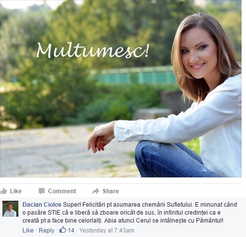 ”Super! Felicitari pentru asumarea chemarii Sufletului. E minunat cand o pasare STIE ca e libera sa zboare oricat de sus, in infinitul credintei ca e creata pt a face bine celorlalti. Abia atunci Cerul se intalneste cu Pamantul!”, a comentat persoana care foloseste numele prim-ministrului.