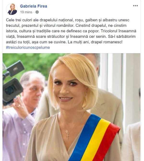 La multi ani, drapel romanesc!|", a scris Firea pe Facebook.