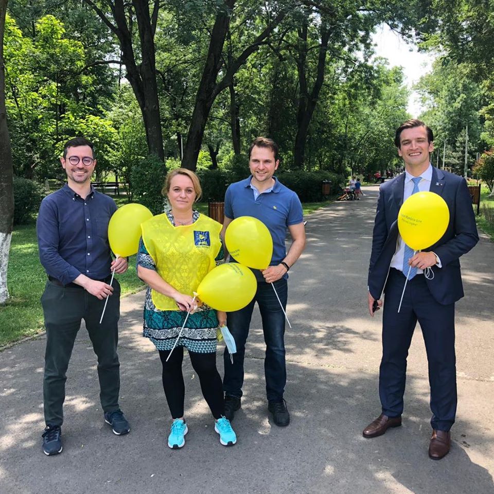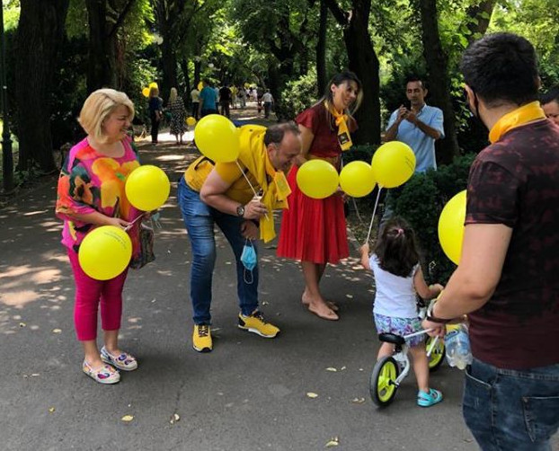 În weekend, liberalii au împărțit copiilor baloane galbene cu sigla PNL. Pozele au apărut apoi pe pagina de Facebook a PNL Sector 1, unde se observă cum reprezentanții PNL nu păstrează distanța, ba mai mlult, nu poartă măștile constant și umflă baloanele cu gura, pe care le oferă apoi copiilor.