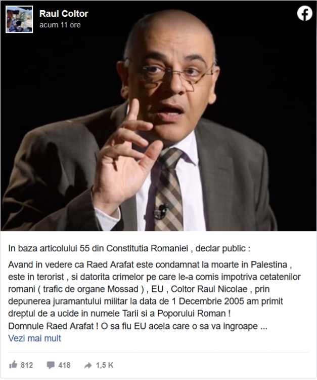 ”În baza articolului 55 din Constituţia României, declar public: Având în vedere că Raed Arafat este condamnat la moarte în Palestina şi datorită crimelor pe care le-a comis împotriva cetăţenilor români ( trafic de organe Mossad ), EU, Coltor Raul Nicolae, prin depunerea jurământului militar la data de 1 Decembrie 2005 am primit dreptul de a ucide în numele Ţării şi a Poporului Român! Domnule Raed Arafat! O să fiu EU acela care o sa va ingroape alături de un porc (animal considerat impur în religia musulmană, n.r.) într-un mormânt de Piatră! Te somez să părăseşti acest teritoriu înainte de întâlnirea noastră! Game over zdreamto!” este mesajul integrat publicat pe Facebook și preluat de adevarul.ro.