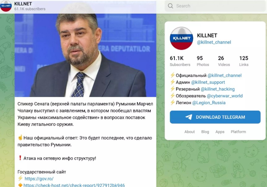 Grupul Killnet a revendicat atacul și susține că acesta a venit în urma declarațiilor făcute de președintele PSD Marcel Ciolacu, potrivit cărora oficialul a promis că va trimite arme letale Kievului.