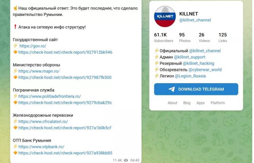Răspunsul nostru oficial: Acesta va fi ultimul lucru pe care l-a făcut guvernul României. Atacul asupra structurii de informații ale rețelei!”, arată Killnet pe contul lor de Telegram.