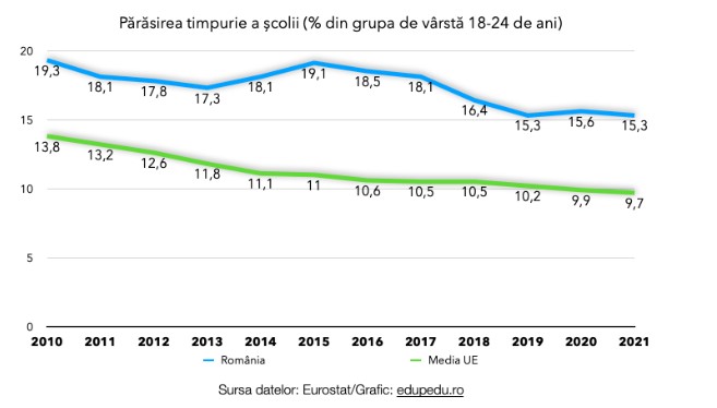 Peste 15% dintre tinerii cu vârste între 18 și 24 de ani, din România, nu terminaseră decât cel mult 8 clase, arată datele Eurostat pentru anul 2021. Anul trecut marchează chiar o ușoară îmbunătățire a indicatorului față de 2020 (15,3% față de 15,6%). La nivelul Uniunii Europene țara noastră rămâne statul cu cea mai mare problemă în acest domeniu dintre toate țările membre.