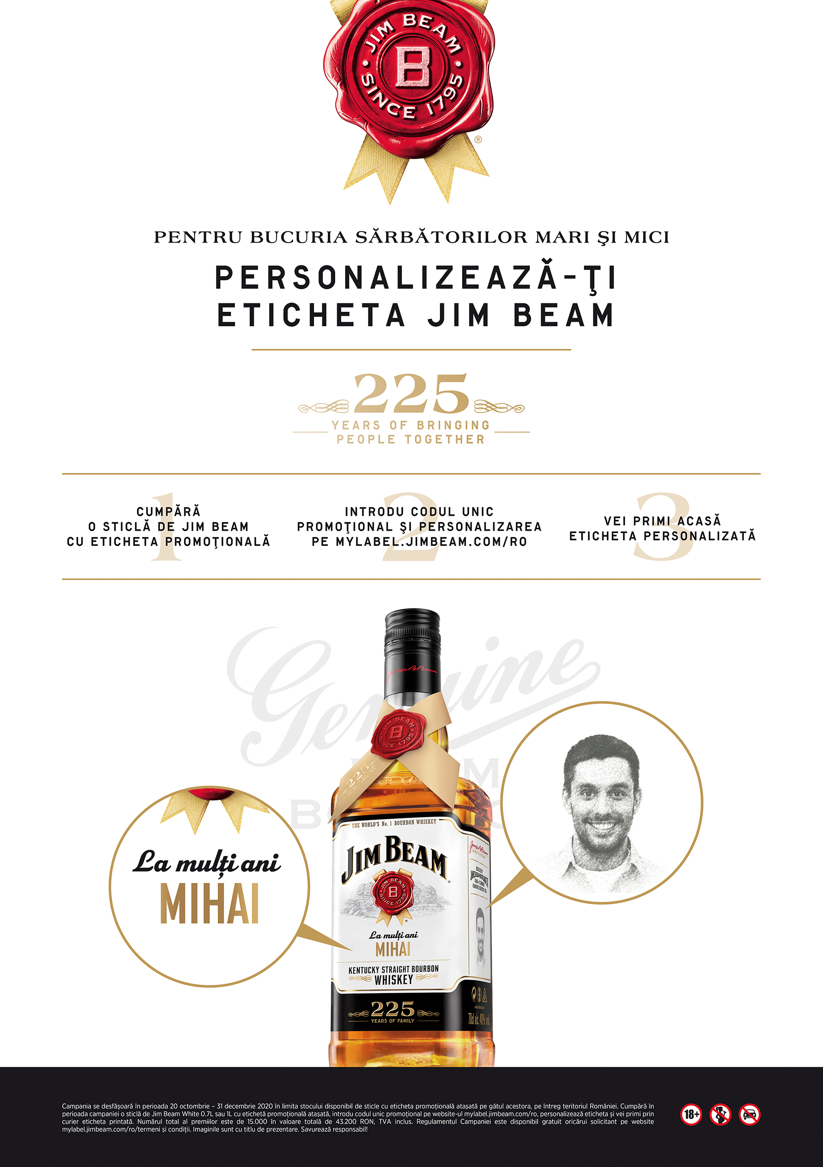 Pentru a celebra acest eveniment, Jim Beam le arată recunoştinţă iubitorilor de bourbon, oferindu-le o experienţă specială, ȋn cadrul campaniei “Personalizează-ţi eticheta Jim Beam!”. Cei care savurează ȋntotdeauna cu plăcere un pahar de bourbon ȋşi pot face un cadou deosebit sau le pot oferi celor dragi un dar surprinzător intrând pe mylabel.jimbeam.com/ro unde au posibilitatea de a ȋşi personaliza eticheta Jim Beam cu fotografiile şi mesajele dorite. Campania se derulează ȋn perioada 20 octombrie-31 decembrie.