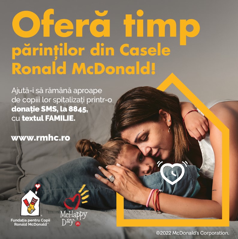 Pentru a susține activitatea Caselor Ronald McDonald și a ține familiile aproape în cele mai vulnerabile momente, McDonald’s în România, partener de misiune al Fundației, aduce în atenția tuturor celor care vor să facă bine o nouă ediție a Campaniei de donații McHappy Day.