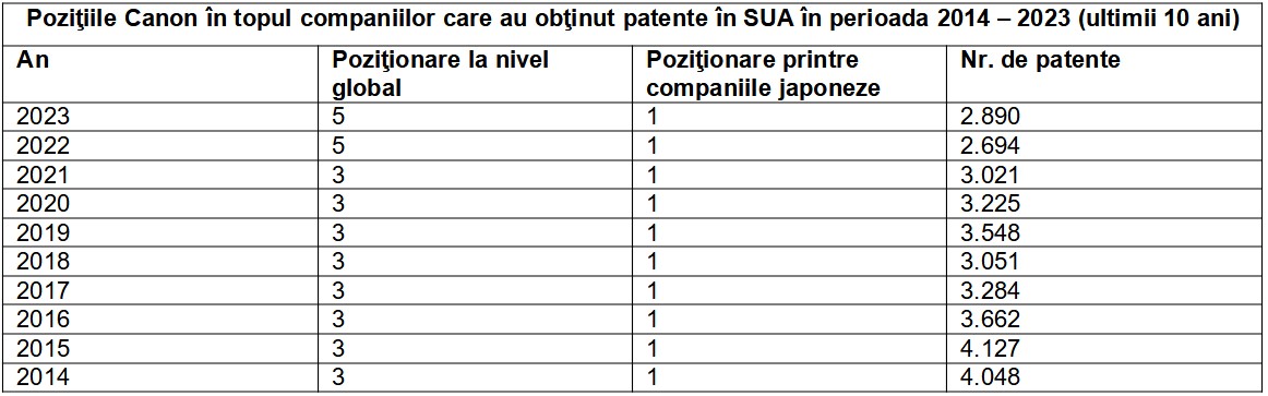 În plus, Canon ocupă primul loc ca număr de patente în topul companiilor japoneze pentru al 19-lea an consecutiv.